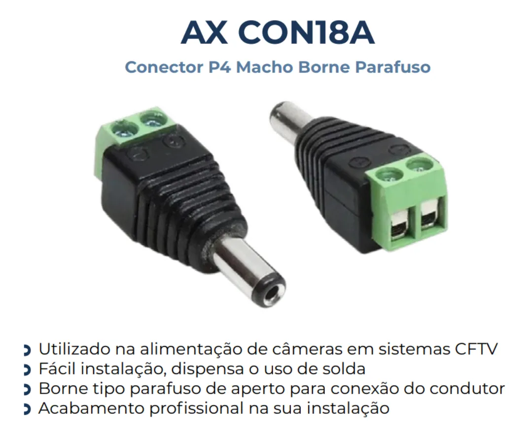O Conector P4 macho CAT5 é especialmente desenvolvido para a alimentação de câmeras de segurança em sistemas CFTV, garantindo uma conexão segura e de alta qualidade. Seu acabamento profissional reduz significativamente a possibilidade de mau contato, assegurando o funcionamento estável dos seus equipamentos.