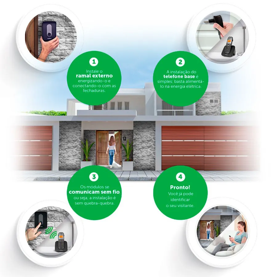 É possível registrar até 6 dispositivos sem fio, entre ramais internos e externos, no telefone base, tendo acesso a funções como transferência de chamadas, comunicação interna e conferencia a três. Instalando mais ramais externos, você aumenta o número de portões que serão monitorados.