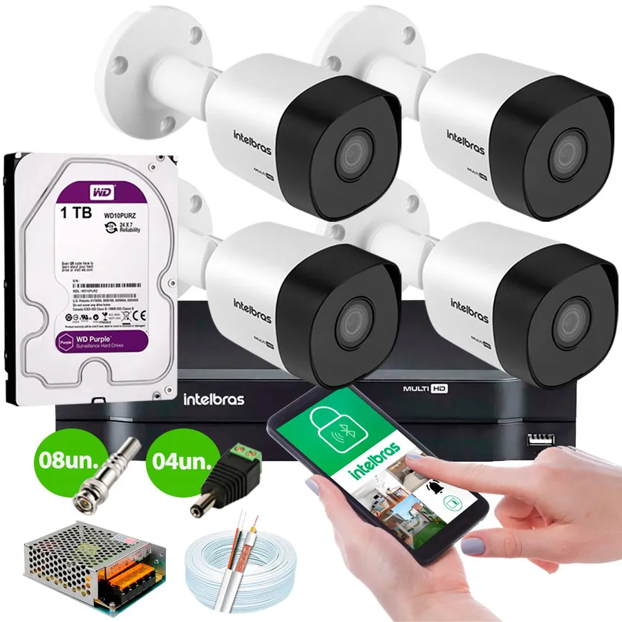 Kit 4 Câmeras VHD 3120 B G6 + DVR Intelbras + HD 1TB para Armazenamento + App Grátis de Monitoramento, Câmeras HD 720p 20m Infravermelho de Visão Noturna Intelbras + Fonte, Cabos e Acessórios