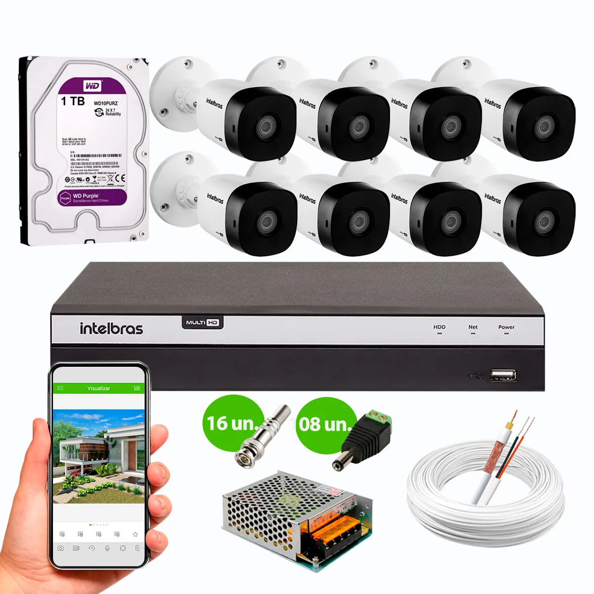 Kit 8 Câmeras de Segurança Full HD Intelbras VHD 1220 B G6 + DVR Intelbras 08 Canais Full HD MHDX 3108 + HD WD Purple 1TB + Acessórios